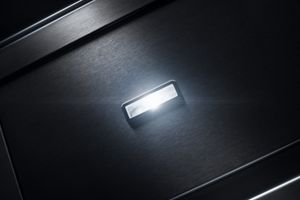 - Upward-facing ambient LED lighting gently illuminates the kitchen, adding a distinctive touch to this ventilation system.